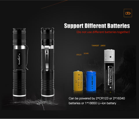Battery: One included 16340 rechargeable li-ion battery or one CR123A lithium battery